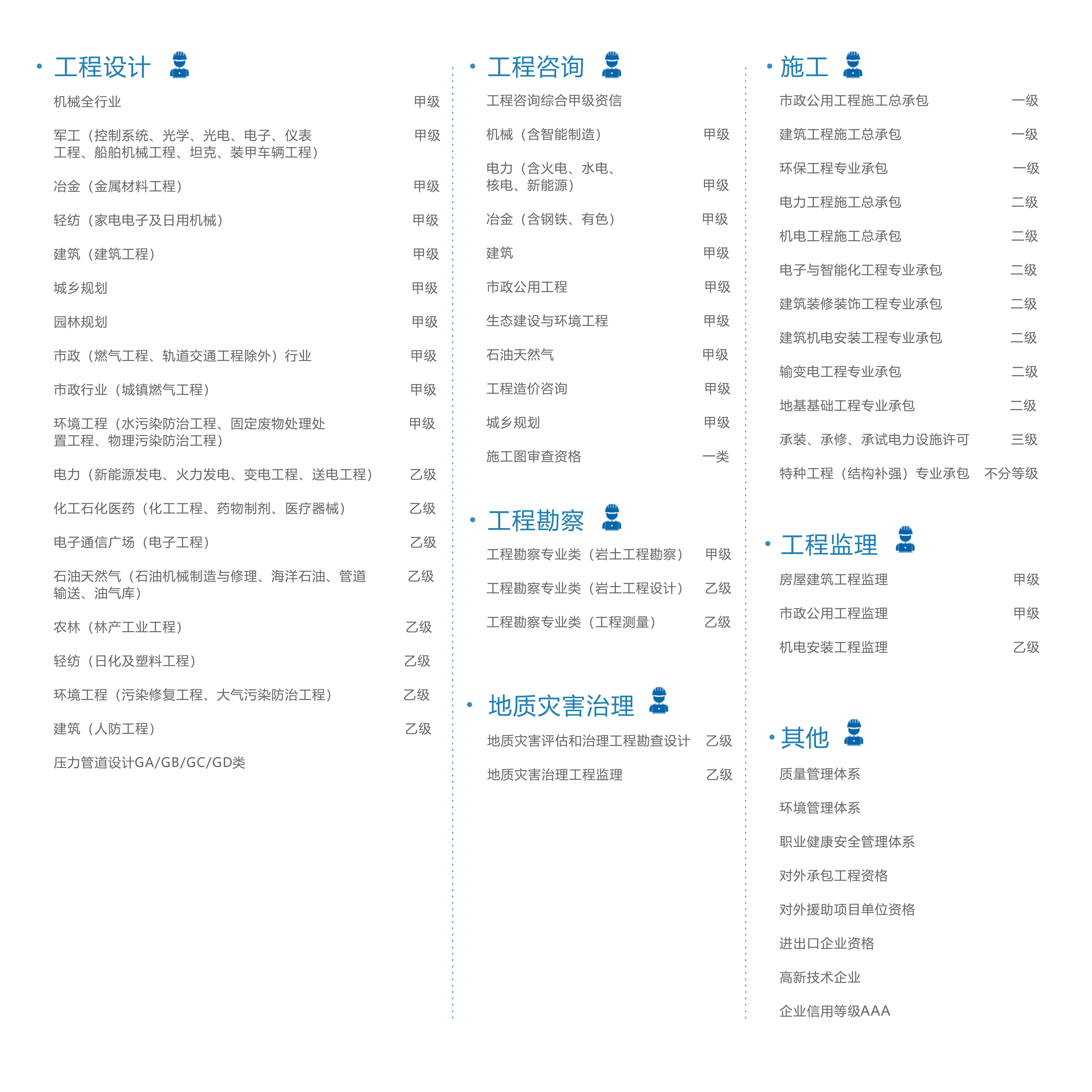 中機國際集結8大行業(yè)32個專業(yè)類別的甲級設計資質,并具有進出口企業(yè)資格和對外承包工程經營資格。全面、專業(yè)的資質水平,為公司快速拓展海內外“兩個市場”奠定了可信可靠的基礎。