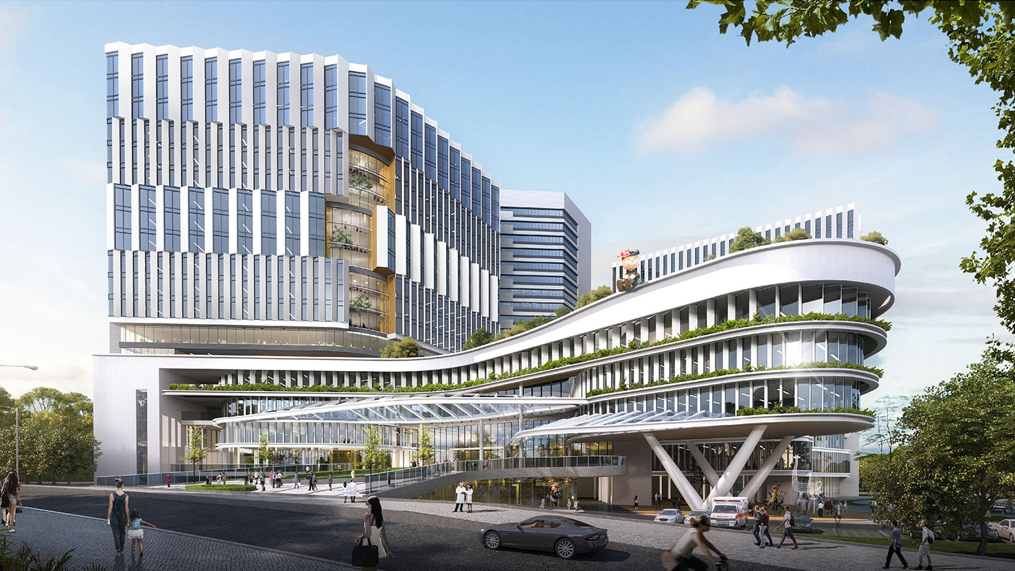 設計背景:項目定位為以婦女兒童為主要服務對象,集婦幼保健、兒童醫(yī)療、科研教學等功能為一體,在創(chuàng)建現代化三級甲等專科醫(yī)院的同時,還需補足科研教學、值班宿舍、行政辦公和食堂等東院區(qū)的功能短板,建成后相對獨立運行。