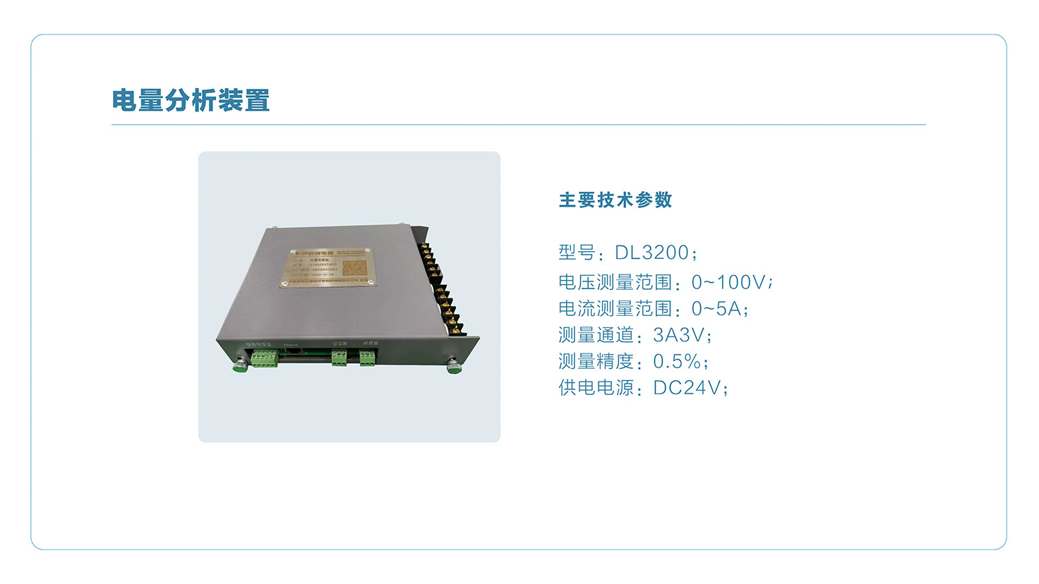 基于成熟的32位ARM嵌入式軟硬件平臺,按照嚴苛工業(yè)環(huán)境電磁兼容等級進行設(shè)計,具有結(jié)構(gòu)緊湊,性能穩(wěn)定,抗干擾性強等特點,可獨立使用或集成至計算機系統(tǒng),標配3電壓和3路電流信號采集接口,同時具備DI測量和DO報警輸出等基本功能,可以應(yīng)用于20~500Hz頻率范圍,滿足并網(wǎng)、電量分析、功率計算等不同應(yīng)用需求。